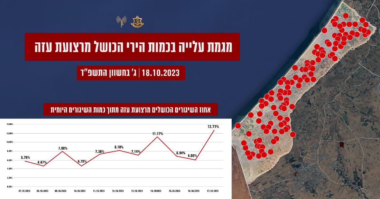 В то же время по словам Хагари, за последние 11 дней боевикам ХАМАС не удалось выпустить примерно 450 ракет. Также он показал карту падения неудачно запущенных террористами ракет, взорвавшихся на территории Газы. В отчете также отмечается, что процент неудачных запусков повышается.