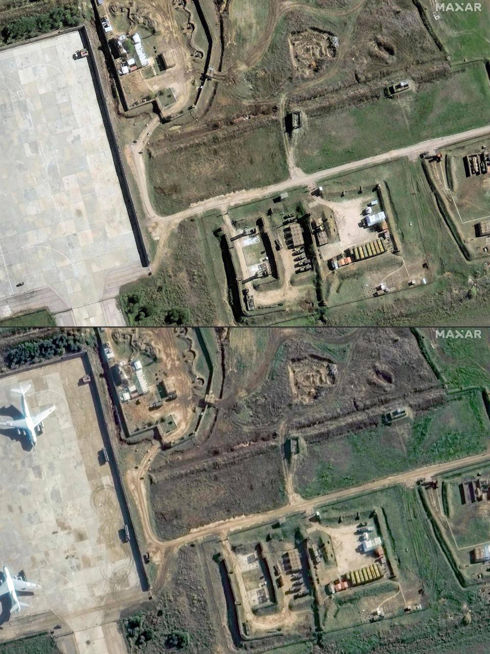 На спутниковых снимках видно, что на авиабазу Хмеймим прибыли два грузовых самолета Ан-124, Ил-76, а также грузовые самолеты более мелких моделей – три Ан-32 и один Ан-72. У самолетов открыты носовые отсеки для приемки тяжелого оборудования.