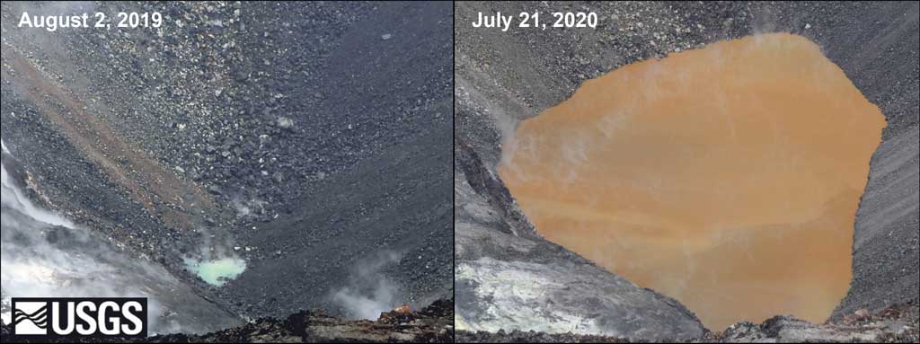 Геологическая служба США (USGS) зафиксировала увеличение температуры в озере, которое образовалось в кратере гавайского вулкана Килауэа, вода здесь нагревается до 80-85 градусов Цельсия.