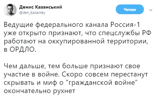 "Ведущие федерального канала Россия-1 уже открыто признают, что спецслужбы РФ работают на оккупированной территории, в ОРДЛО. Чем дальше, тем больше признают свое участие в войне. Скоро совсем перестанут скрывать и миф о "гражданской войне" окончательно рухнет", - написал журналист.