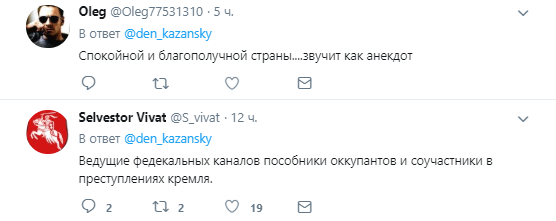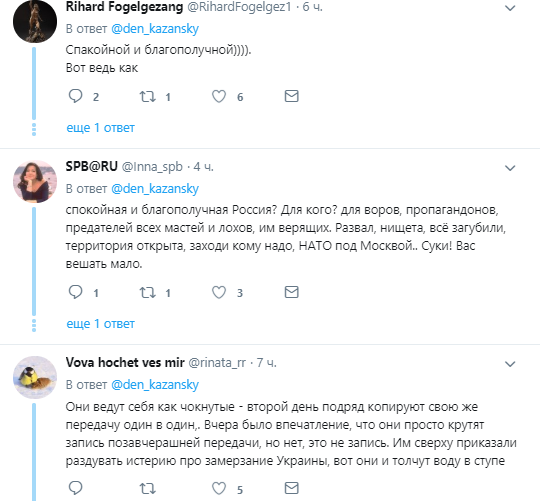 "Спокойной и благополучной страны....звучит как анекдот", "Ведущие федекальных каналов пособники оккупантов и соучастники в преступлениях кремля", "Они ведут себя как чокнутые - второй день подряд копируют свою же передачу один в один,. Вчера было впечатление, что они просто крутят запись позавчерашней передачи, но нет, это не запись. Им сверху приказали раздувать истерию про замерзание Украины, вот они и толчут воду в ступе", - пишут комментаторы.