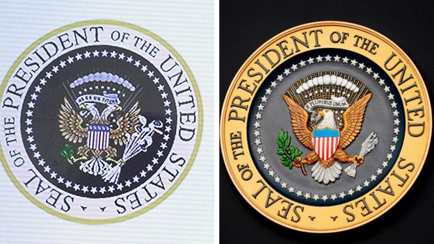 На настоящей президентской печати он держит 13 стрел, которые символизируют 13 первых американских штатов. На искаженной печати в левой лапе орла - клюшки для гольфа. Согласно Washington Post, после вступления в должность президента, к октябрю 2018 года Трамп посетил свое поле для гольфа в штате Вирджиния более 40 раз, а в свой частный клуб в штате Нью-Джерси он приезжал 70 раз. Гольф-поездки Трампа обошлись налогоплательщикам США по меньшей мере в 102 млн долларов.