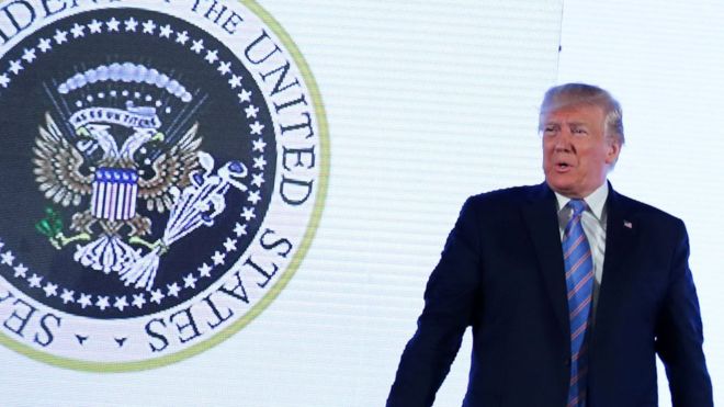 Во время выступления президента США Дональда Трампа на студенческом саммите в Вашингтоне, за его спиной появилось изображение искаженной президентской печати в виде двуглавого орла с клюшками для гольфа.