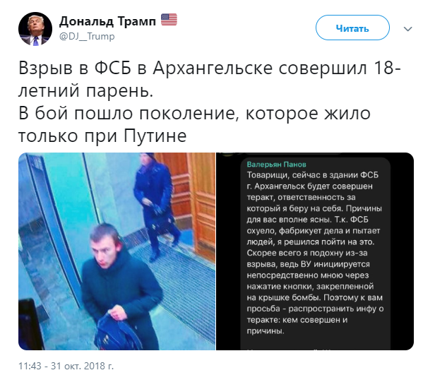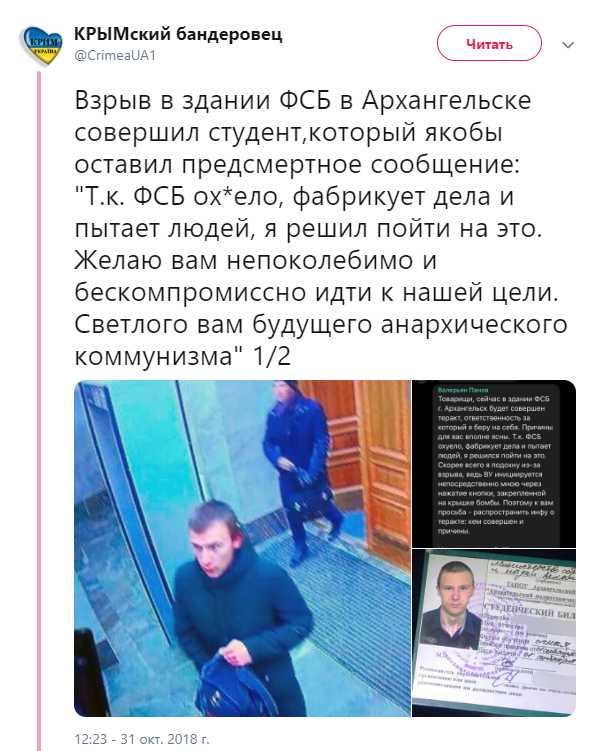 Также сообщалось, что анархист под ником Валерьян Панов утром написал в Telegram, что это он устроил взрыв в здании ФСБ.