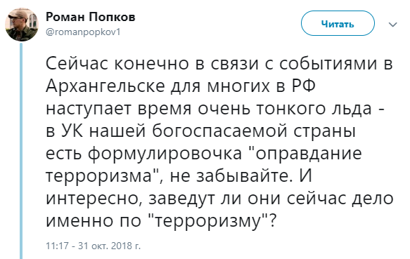 "Сейчас конечно в связи с событиями в Архангельске для многих в РФ наступает время очень тонкого льда - в УК нашей богоспасаемой страны есть формулировочка "оправдание терроризма", не забывайте. И интересно, заведут ли они сейчас дело именно по "терроризму"?", - написал московский журналист и активист Роман Попков.