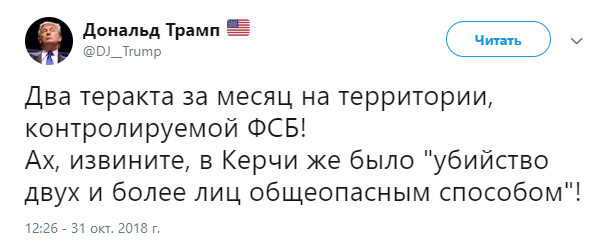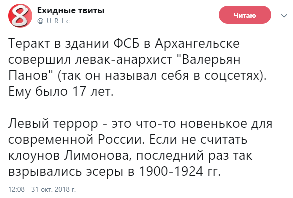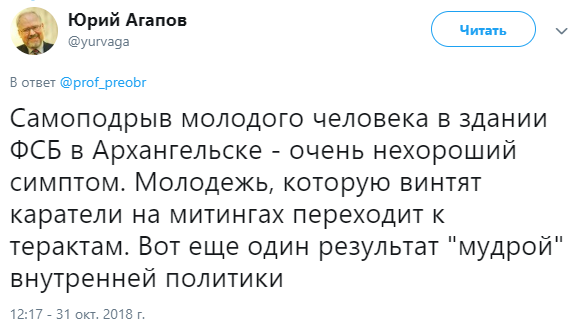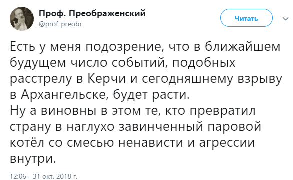 "Есть у меня подозрение, что в ближайшем будущем число событий, подобных расстрелу в Керчи и сегодняшнему взрыву в Архангельске, будет расти. Ну а виновны в этом те, кто превратил страну в наглухо завинченный паровой котел со смесью ненависти и агрессии внутри", - написал пользователь под ником Проф. Преображенский.