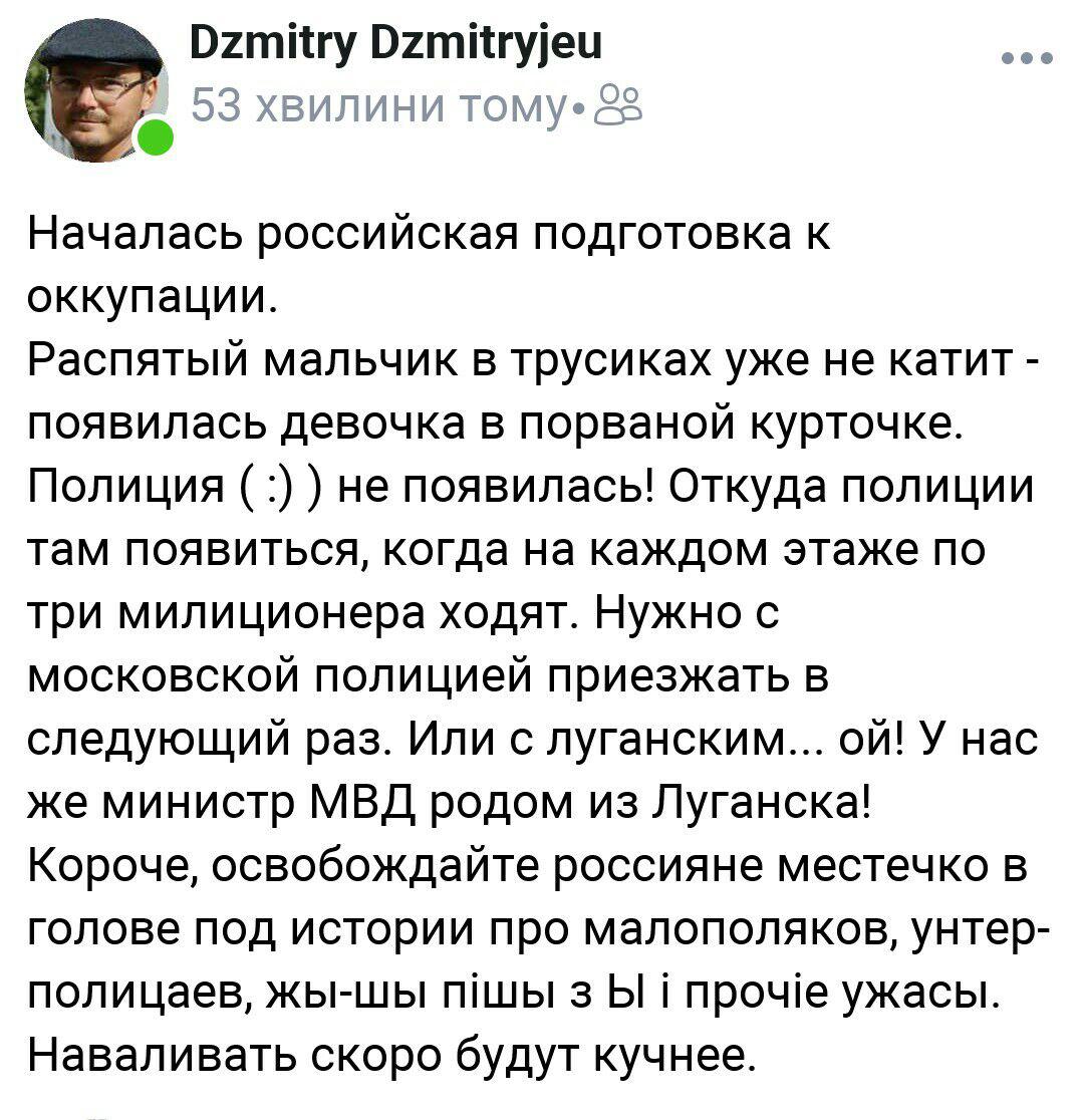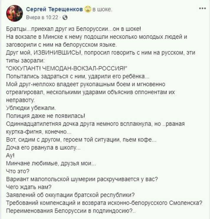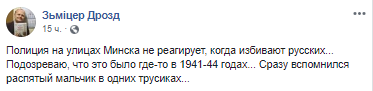 "Полиция на улицах Минска не реагирует, когда избивают русских... Подозреваю, что это было где-то в 1941-44 годах... Сразу вспомнился распятый мальчик в одних трусиках...", - написал он.