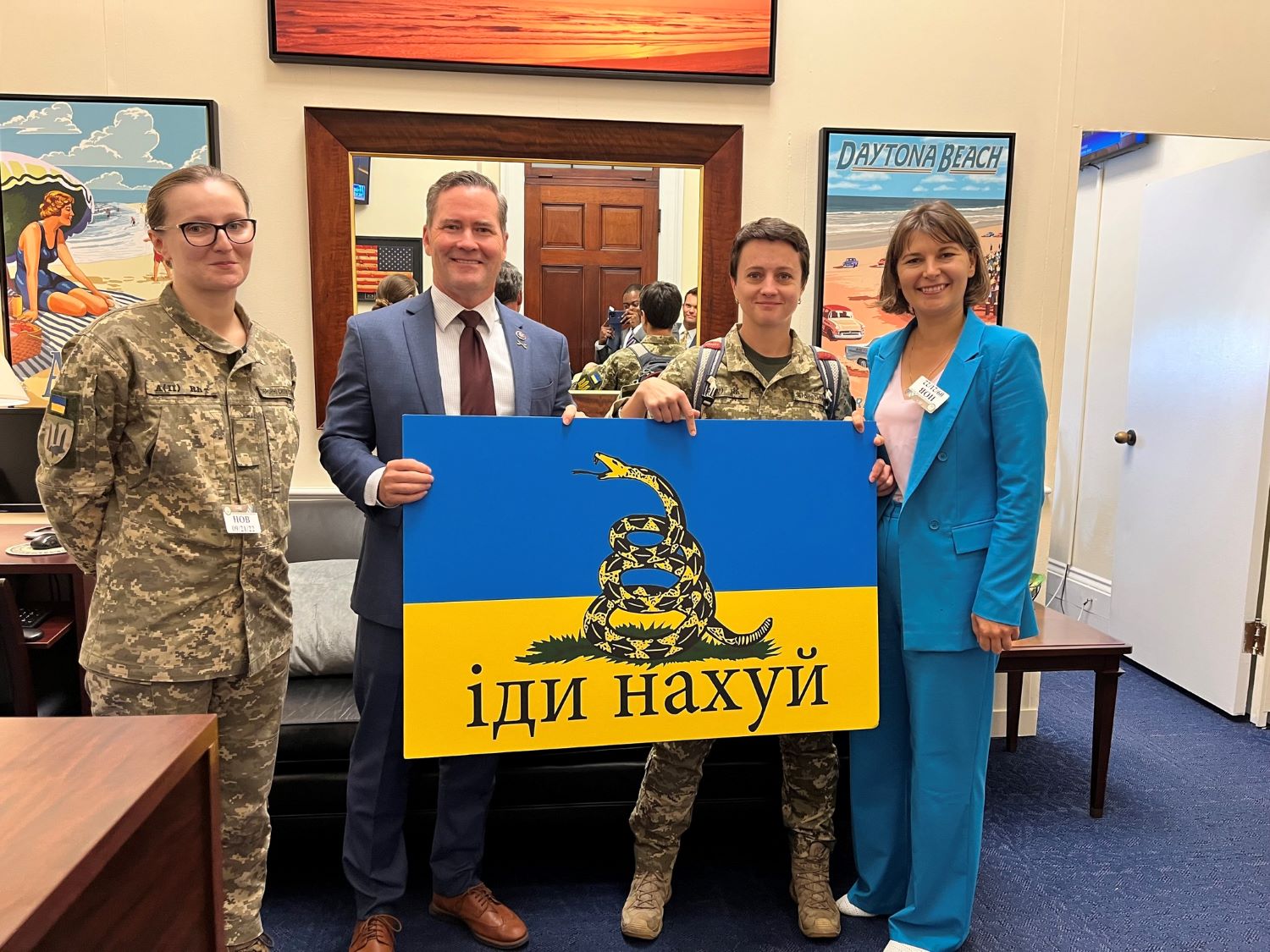 "В сентябре 2022 у нас была теплая встреча с Конгрессменом Волтцом. Девушки-военные Дарья Зубенко и Иванна Чобанюк подарили Майклу монету, выкованную из подбитого российского танка с харьковского успешного контрнаступления. В те дни мы адвокатировали передачу Украине бронированных автомобилей Bradley и танков Abrams... А о мировоззрении Волтца можете судить по картине, которая висела у него на входе в кабинет", - написала журналистка, опубликовав фото.