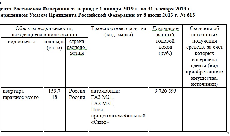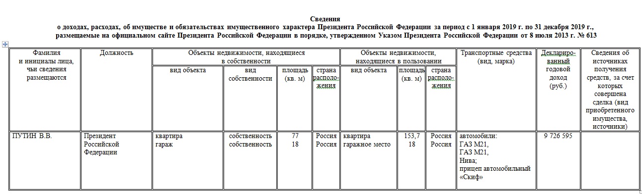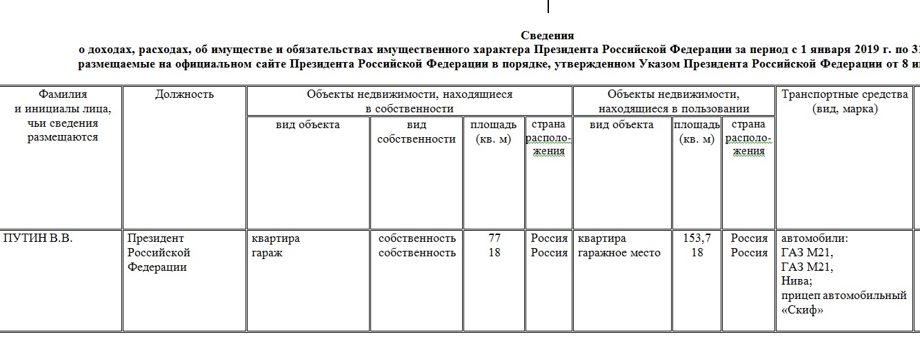 Об этом стало известно из декларация об имуществе, доходах и расходах главы государства, работников Администрации президента и членов их семей за 2019 год, которую опубликовали на сайте Кремля.