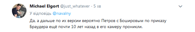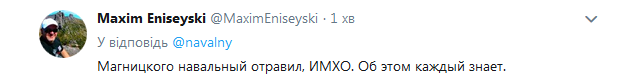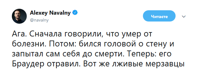 "Ага. Сначала говорили, что умер от болезни. Потом: бился головой о стену и запытал сам себя до смерти. Теперь: его Браудер отравил. Вот же лживые мерзавцы", - написал оппозиционер, главный враг президента РФ Владимира Путина Алексей Навальный.