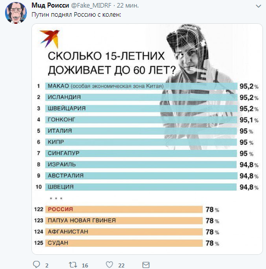 На статистической графике под названием "Сколько 16-летних доживает до 60 лет" видно, что Россия занимает 122 место рядом с Папуа Новой Гвинеей, Афганистаном и Суданом.