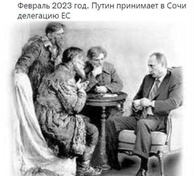 Экс-министр иностранных дел Австрии Карин Кнайсль оконфузилась, опубликовав в социальной сети картинку по мотивам работы Владимира Серова "Ходоки у Ленина", где вместо Ленина – Путин, а вместо ходоков – делегация ЕС.