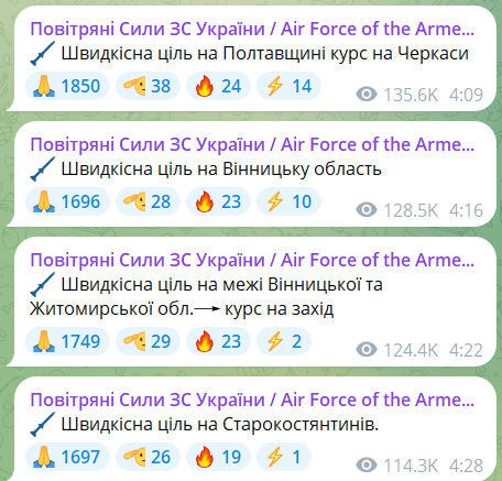 Стоит отметить, что во время атаки Россия применила не только ударные "Шахеды" – Воздушные силы ВС Украины предупреждали также о скоростных целях.