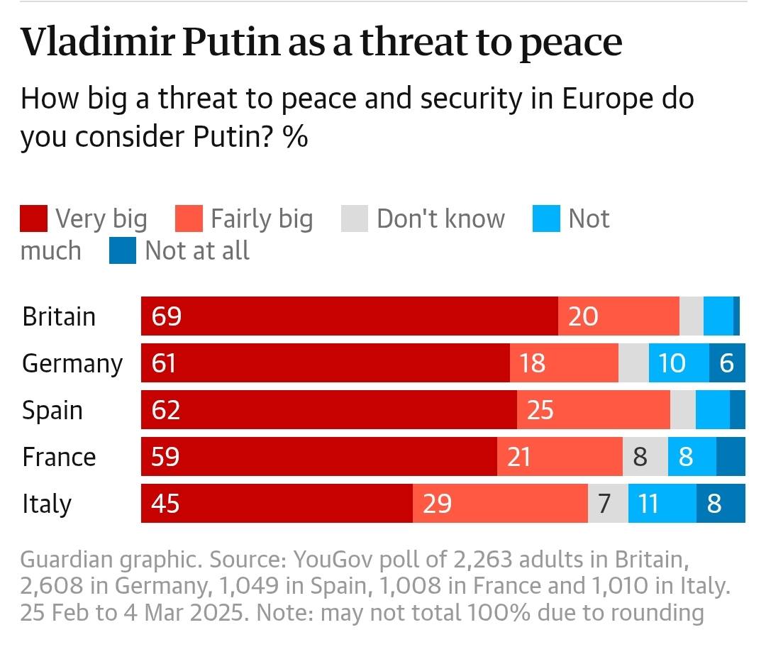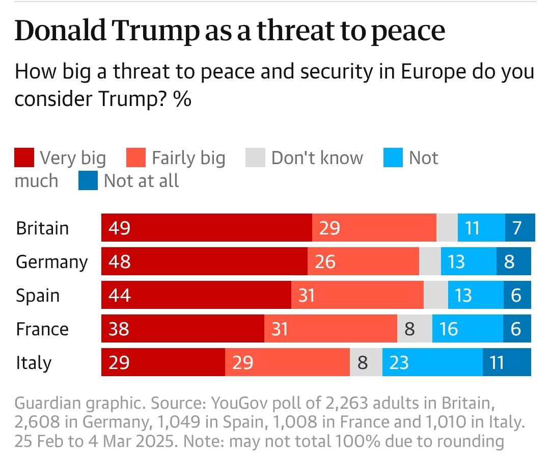 В Великобритании "очень большой угрозой" Трампа считают 49% опрошенных, 29% - "значительным". В Германии – соответственно 48% и 26%, Испании – 44% и 31%, Франции – 38% и 31%, Италии 29% и 29%. При этом Путина "очень большой угрозой" считают от 45 до 69 процентов опрошенных.