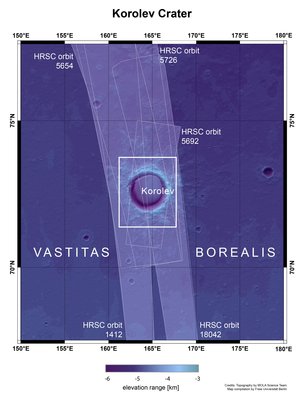 Кратер Королева является одним из самых крупных на Марсе - его площадь составляет 82 километра, и она целиком заполнена льдом. Толщина льда может доходить в самые холодные времена до 2 километров.