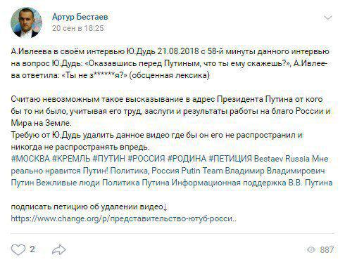 Пользователи анонимного имиджборда "Двач" обнаружили во "ВКонтакте" страницу некоего Артура Бестаева: на ней есть пост от 20 сентября, в котором автор указывает на недопустимость употребления Ивлеевой обсценной лексики при обсуждении президента России Владимира Путина.