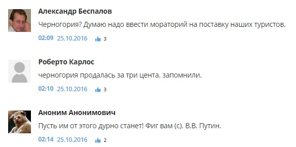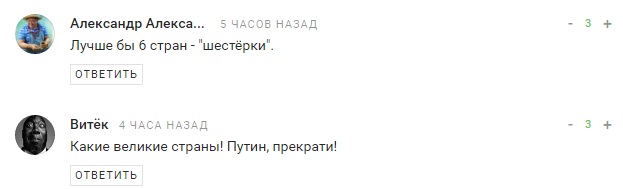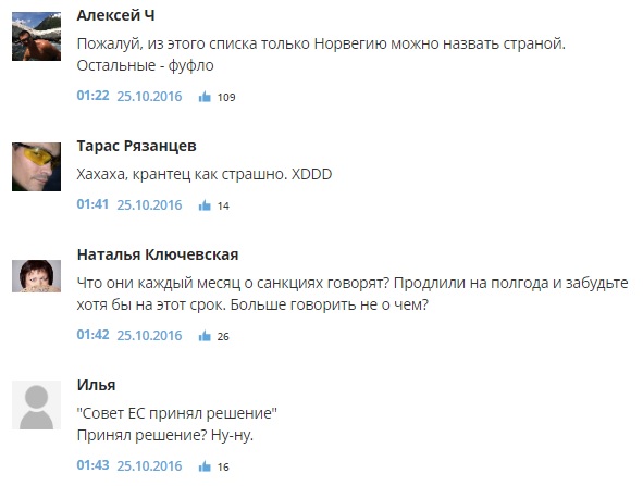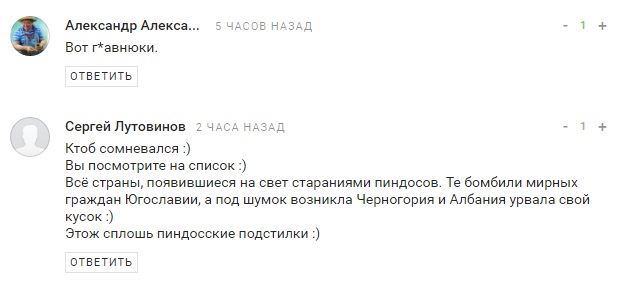 "Пожалуй, из этого списка только Норвегию можно назвать страной. Остальные – фуфло", "Подстилки", "А Экваториальная Гвинея почему не в списке??", "Авангард пресмыкающихся шакалов", "Ввести ответные санкции против не дружественных стран! Хохлам перекрыть газ! В норвегию не продавать рыбу и не брать их тухляк! Черногорию тоже унизить и растоптать публично на уровне мида! С албанией и лихтиншейтном и так все ясно! Хватит утираться пора их ипашить в ответ!!!!", - пишут комментаторы.