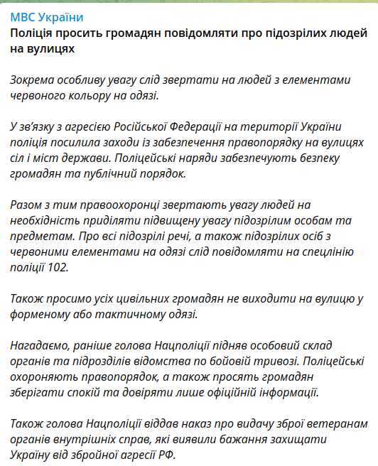 11:15 Полиция просит граждан сообщать о подозрительных людях на улицах. Ко всем гражданским просьба не выходить на улицу в форменной или тактической одежде.