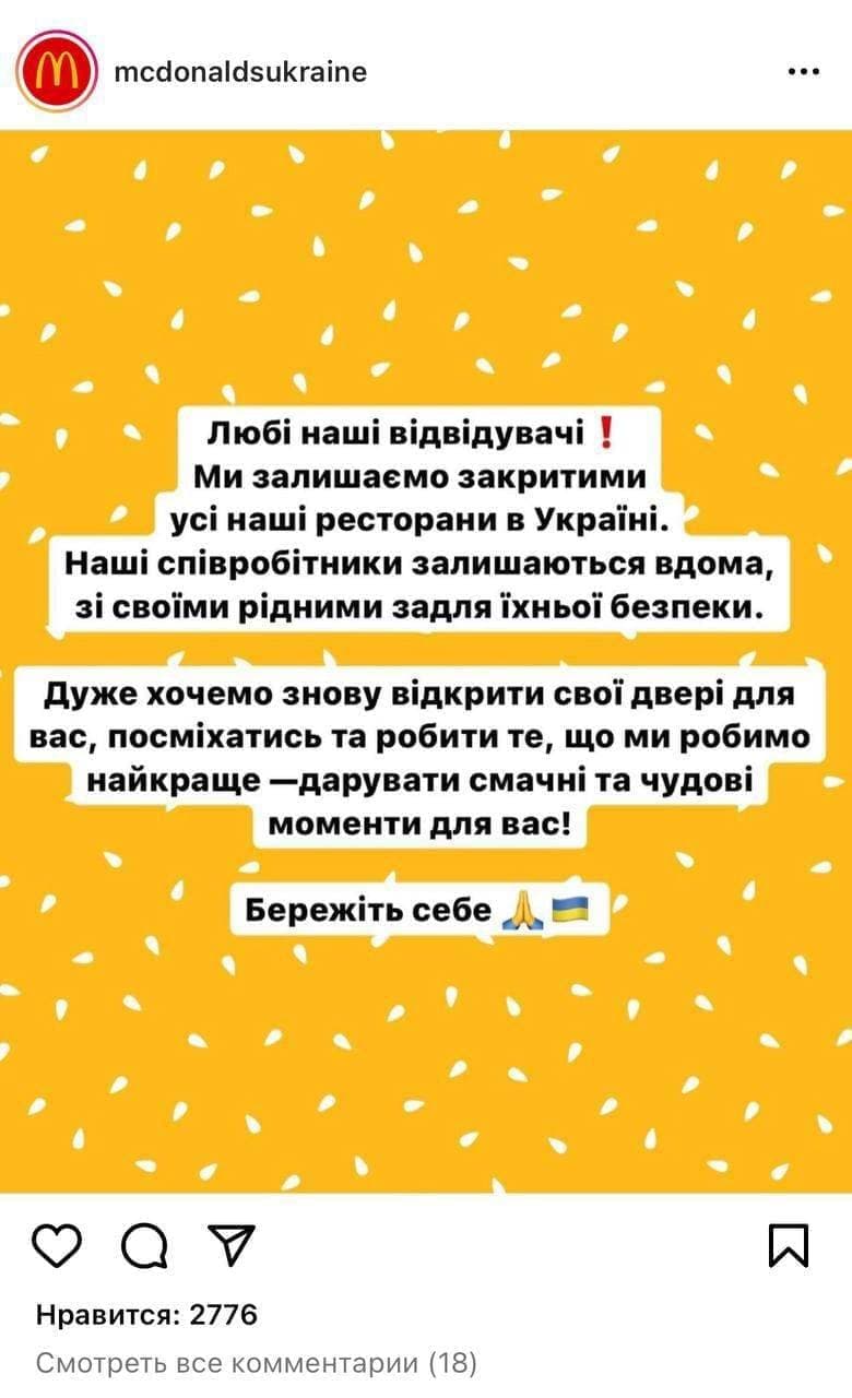 14:20 McDonald"s временно приостанавливает свою работу в Украине.
