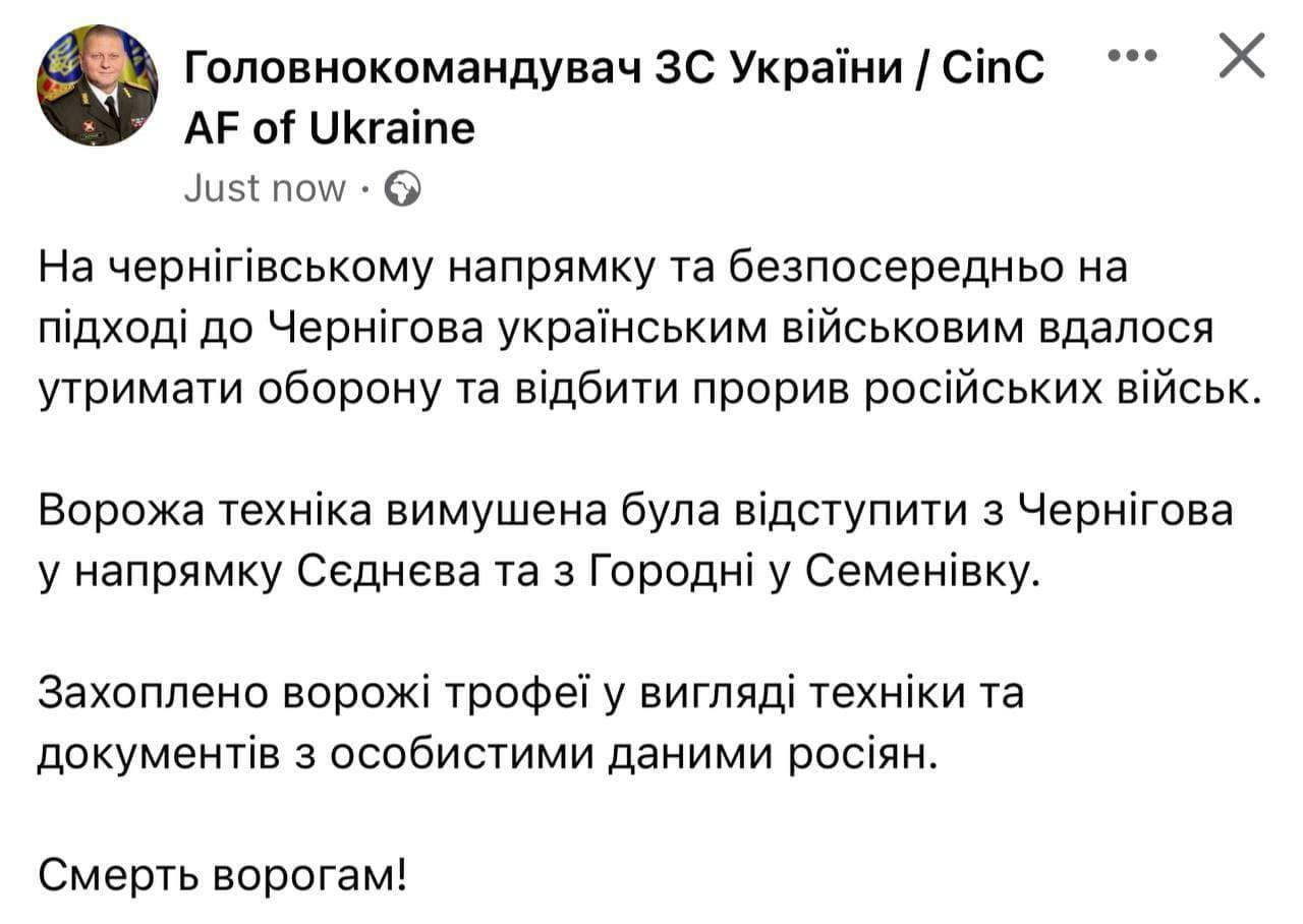 Механизированные и танковые подразделения ведут оборону на севере по рубежу Перемога-Глухов. Колонна русских оккупантов остановлена. 1-я отбр продолжает бой на окраине ЧЕРНИГОВА.