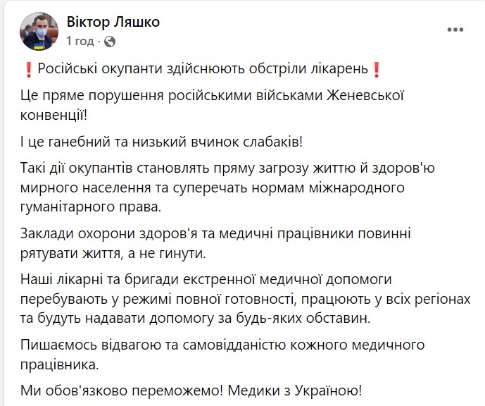 19:15. оккупанты ведут обстрел больниц и госпиталей, нарушая все мыслимые и немыслимые законы войны - сообщил министр здравоохранения Виктор Ляшко