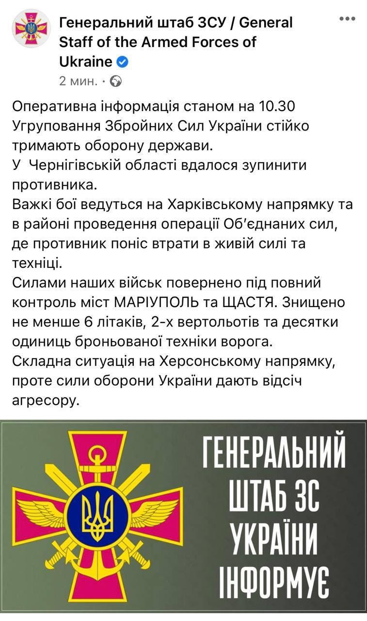 Фашисты продолжают ведение полномасштабной агрессии против Украины. В настоящее время из 90 батальонных тактических групп на территорию Украины введено более 60. Основные усилия противник сосредоточивает на Слобожанском, Северском, Таврическом направлениях. С разрешения еще одного "братского народа", Республики Беларусь, производятся демонстрационные действия вдоль северного участка государственной границы Украины самолетами Су-25СМ. Уже понятен коварный план российских захватчиков. Основной целью операции является блокировка Киева, создание сухопутного коридора к полуострову Крым и самопровозглашенной ПМР.