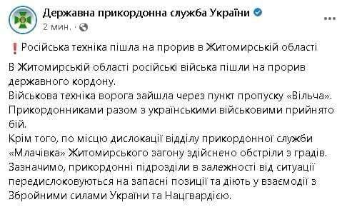 13:09 Погранслужба заявляет о прорыве российских войск через границу в Житомирской области.