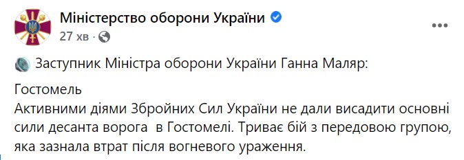 23:15. а вот в Гостомеле бои продолжаются, сообщила заместитель министра обороны Анна Маляр.