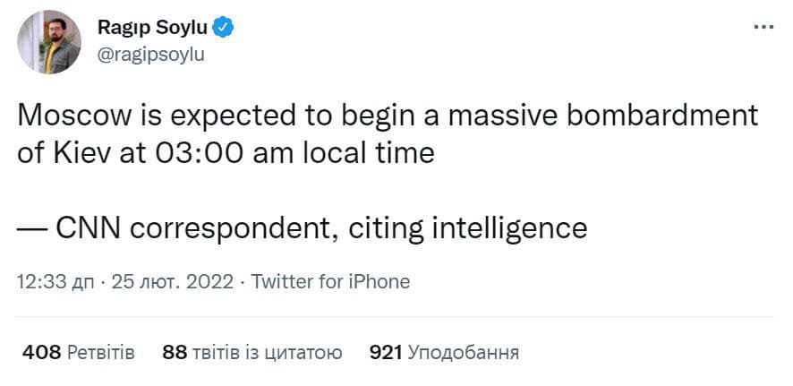02:35 СNN предупредила, что, согласно данным разведки, в 3:00, Россия начнет авиаудары по Киеву.