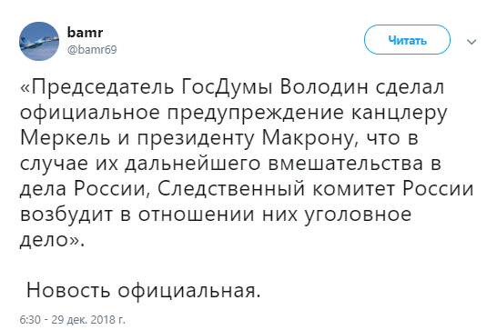 По его словам, Меркель и Макрон "должны осознавать, что вмешательство в процесс правосудия не просто недопустимо, но и может привлечь внимание правоохранительных органов".