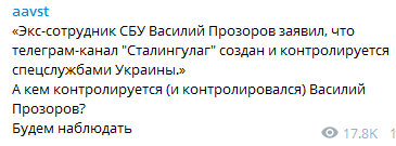 "Экс-сотрудник СБУ Василий Прозоров заявил, что телеграм-канал "Сталингулаг" создан и контролируется спецслужбами Украины" А кем контролируется (и контролировался) Василий Прозоров? Будем наблюдать", - говорится в Telegram-канале aavst.
