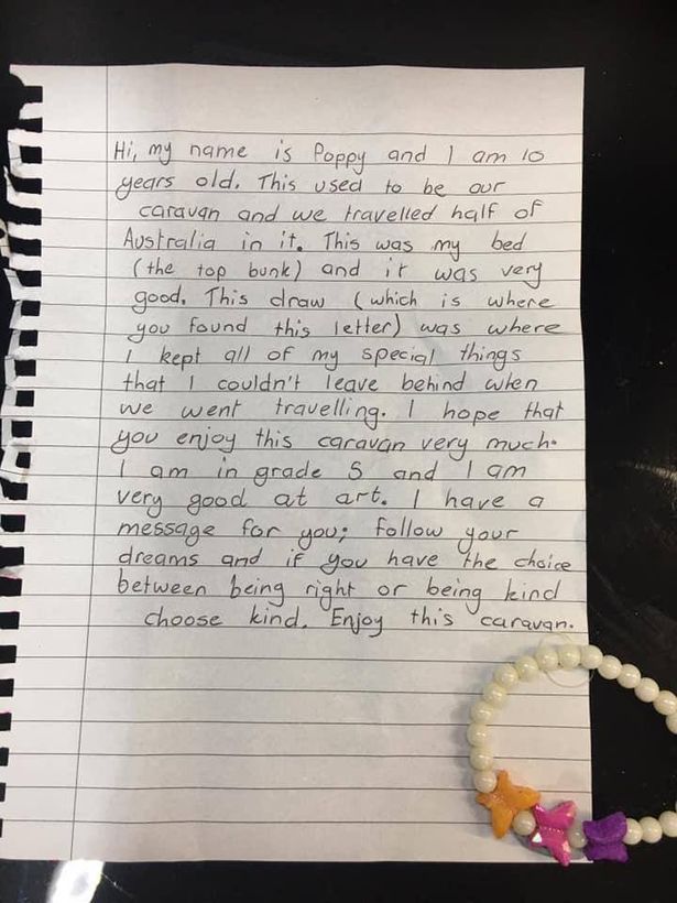 "Раньше это был наш фургон, и мы проехали в нем половину Австралии. Это была моя кровать (верхний ярус ), и она была очень хорошей. В этой тумбочке (где вы нашли это письмо) я хранила все свои особенные вещи, которые не могла оставить, когда мы отправились в путешествие. Надеюсь, вам очень понравится этот фургон", - написала Поппи.