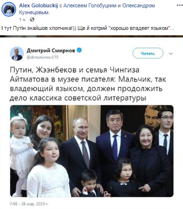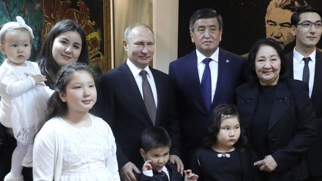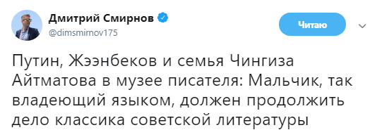 "Путин, Жээнбеков и семья Чингиза Айтматова в музее писателя: Мальчик, так владеющий языком, должен продолжить дело классика советской литературы", - подписал он снимок.
