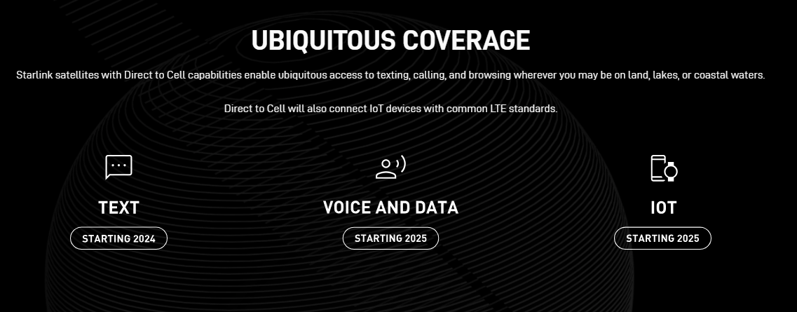 На сайте Starlink сообщается, что в 2024 году сначала услуга будет ограничена только текстовыми сообщениями, а затем, в 2025 году, появятся возможность передачи голоса, данных и файлов.