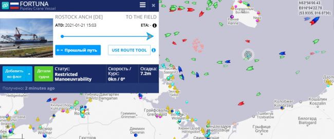 Строительство трубопровода баржа "Фортуна" не проводит уже вторые сутки. Также судно "Балтийский исследователь", которое осуществляет мониторинг укладки газопровода прибыло в Росток.