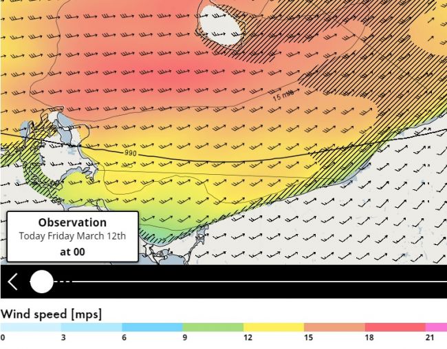 Штормовое предупреждение было объявлено 11 марта. Порывы ветра достигают 20 м/с, говорится на сайте Шведского института гидрологии и метеорологии (SMHI). Непогода продлится до 15 марта.