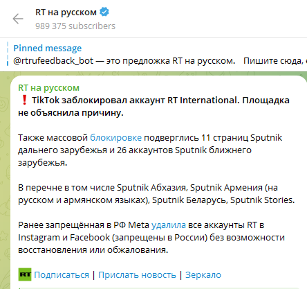 TikTok заблокировал аккаунт RT International. Сообщается, что блокировку также подверглись 11 страниц Sputnik дальнего зарубежья и 26 аккаунтов Sputnik ближнего зарубежья. В списке в частности Sputnik Абхазия, Sputnik Армения, Sputnik Беларусь, Sputnik Stories.