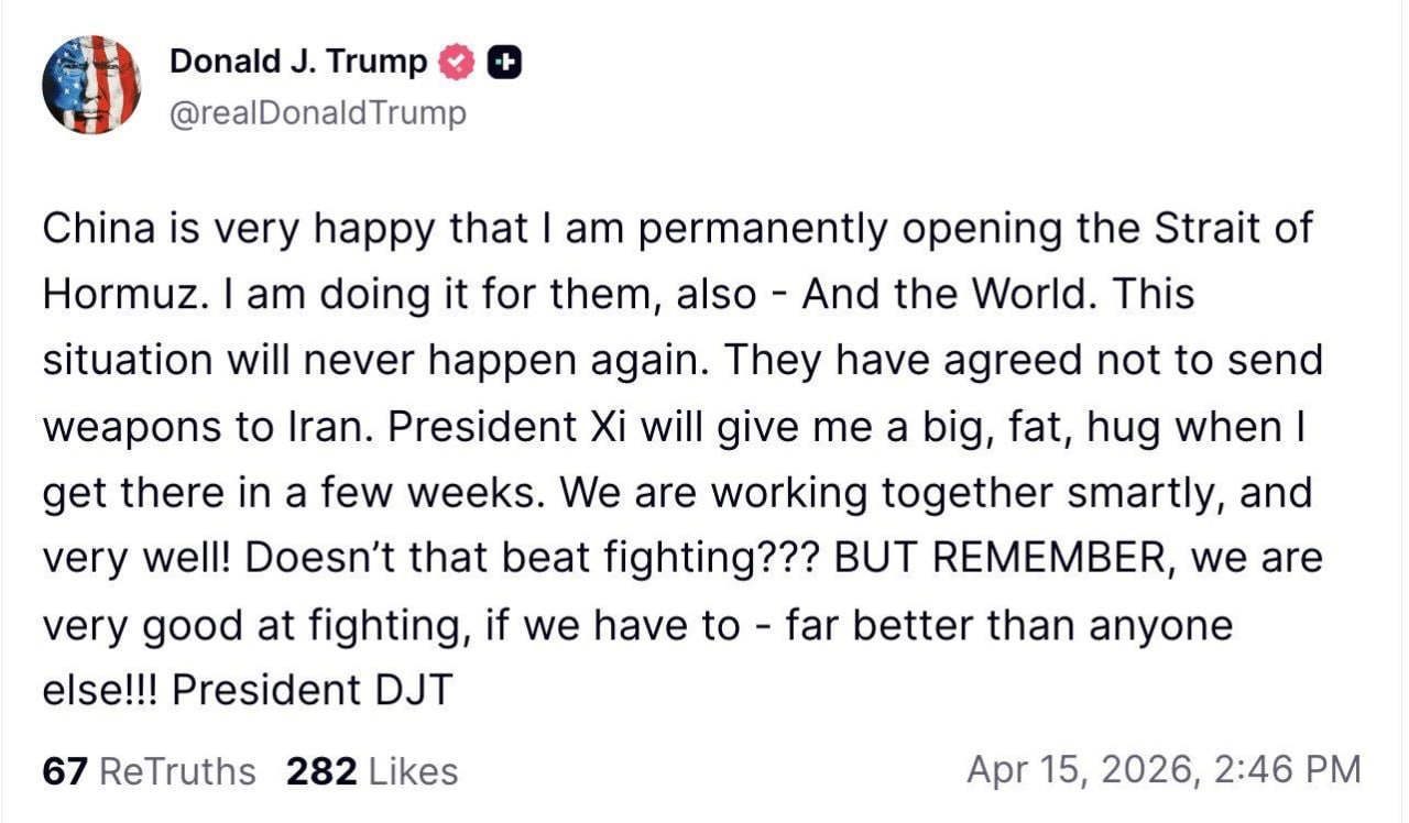 "Президент Си крепко-крепко обнимет меня, когда я туда приеду. Мы работаем вместе разумно и очень хорошо. Разве это не лучше, чем воевать??? НО ПОМНИТЕ, мы очень хорошо умеем воевать, если придется - гораздо лучше любого другого!!!" – написал Трамп в Truth Social.