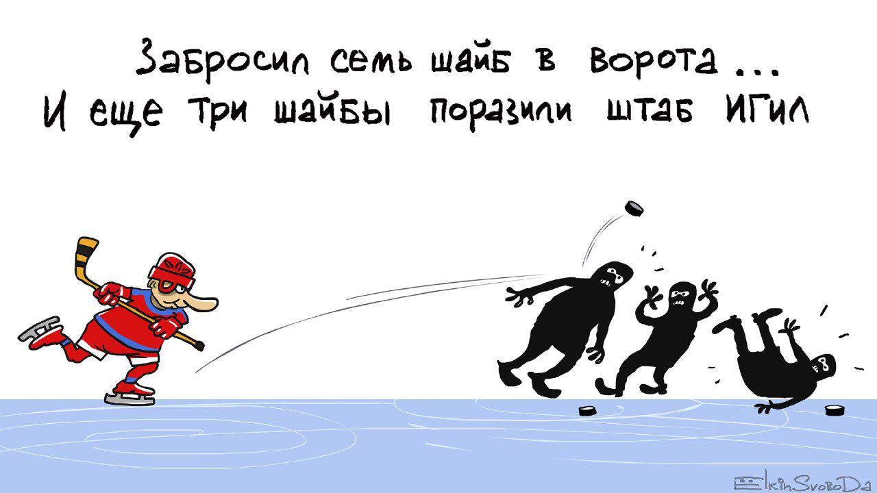 "Забросил семь шайб в ворота… И еще три шайбы поразили штаб ИГИЛ", - подписал он карикатуру.