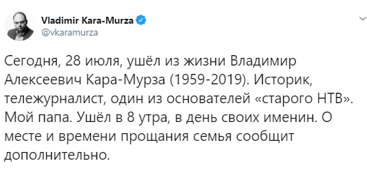 "Сегодня, 28 июля, ушел из жизни Владимир Алексеевич Кара-Мурза (1959-2019). Историк, тележурналист, один из основателей "старого НТВ". Мой папа. Ушел в 8 утра, в день своих именин. О месте и времени прощания семья сообщит дополнительно", – написал он.