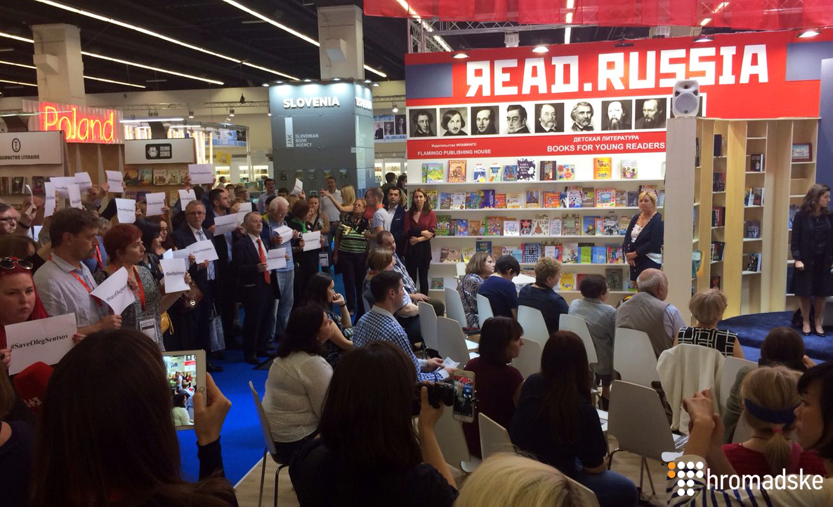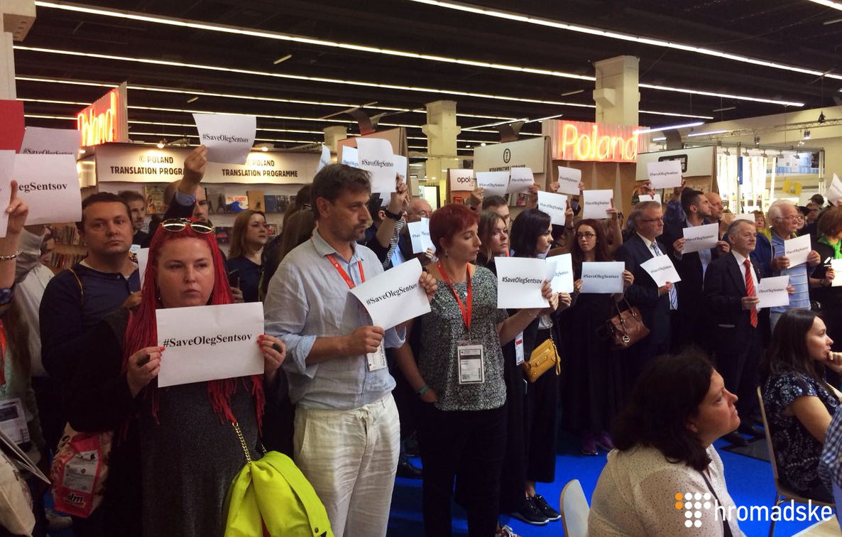 13 октября около полусотни украинский и посетителей книжной ярмарки во Франкфурте-на-Майне устроили молчаливую акцию у российского стенда с призывом освободить украинского политзаключенного, режиссера Олега Сенцова.