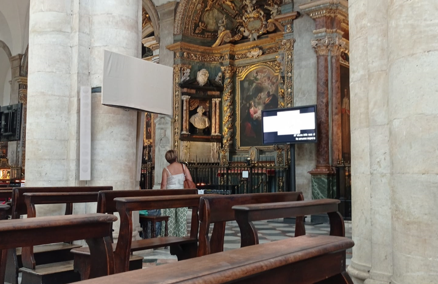 По ее словам, в храме разместили монитор, где бегущая строка рассказывает иностранцам о главной святыне храма - плащанице, в которую был обернут Иисус Христос. Текст написан на двух языках - итальянском и русском.
