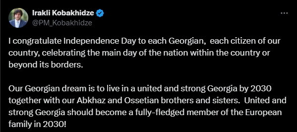 "Наша грузинская мечта - жить в единой и сильной Грузии к 2030 году вместе с нашими абхазскими и осетинскими братьями и сестрами. Единая и сильная Грузия должна стать полноправным членом европейской семьи в 2030 году!", - написал Кобахидзе.