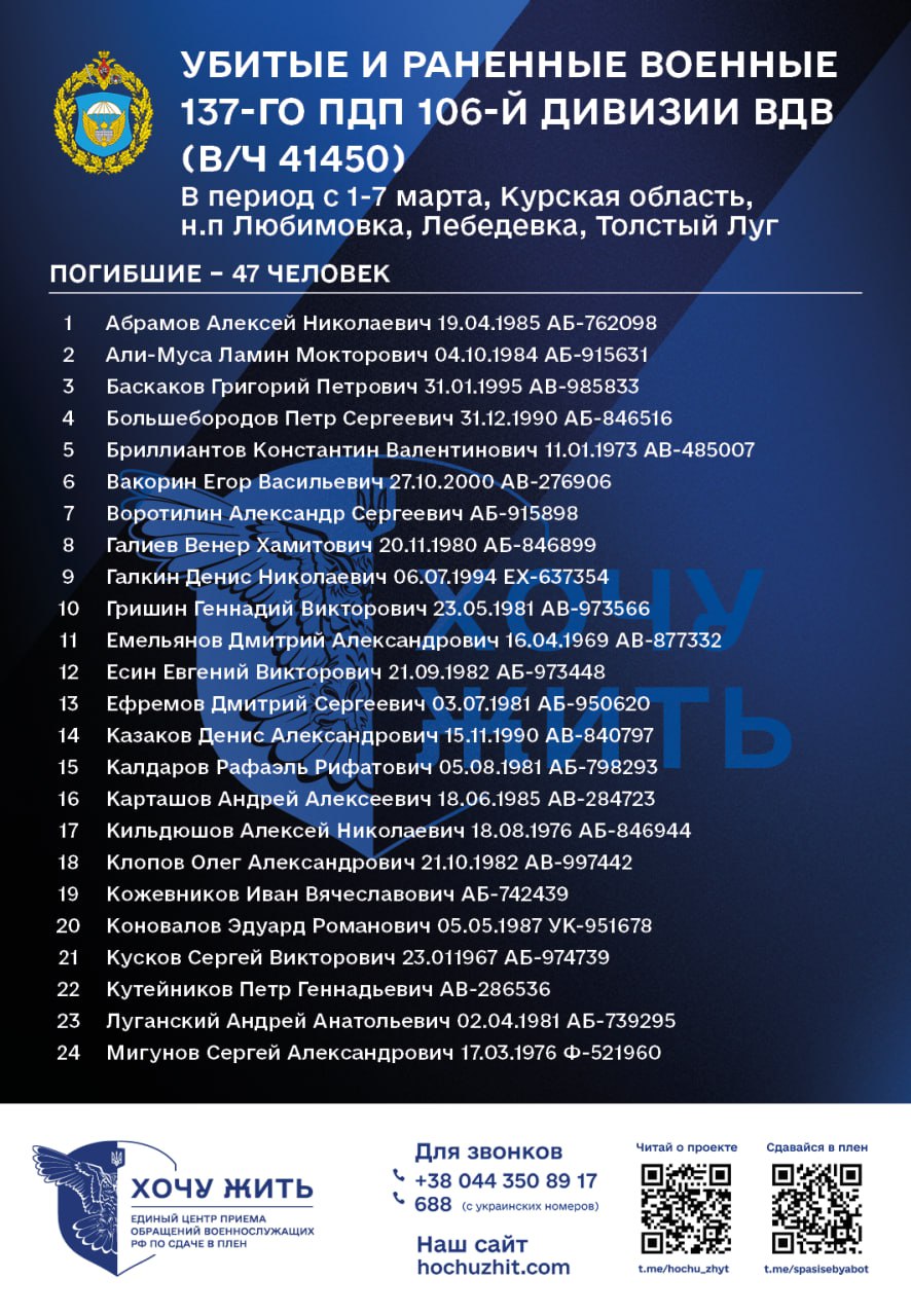 Проект Главного управления разведки Министерства обороны Украины "Хочу жить" представил неполный список погибших и раненых десантников элитного 137-го гвардейского парашютно-десантного полка 106-й дивизии ВДВ ВС РФ из города Рязань (РФ). Эти утраты русской армии касаются Курской области.