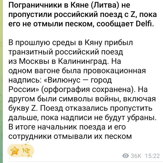 "В прошлую среду на КПП в Кяну пришел транзитный поезд Москва-Калининград. На одном из вагонов пограничники заметили нанесенный черной краской символ Российской армии Z и надпись ZOV. На другом вагоне была надпись на русском языке: "Вильнюс - русский город", - пишет издание.