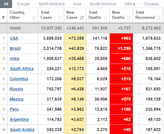 За сутки в США подтвердили 73 тысячи новых больных, в Бразилии - почти 44 тысячи, в Индии - 35, 5 тысяч, в Южной Африке - более 13 тысяч, в Колумбии - 8 тысяч, в России - 6,4 тысячи, в Мексике - более 6 тысяч.