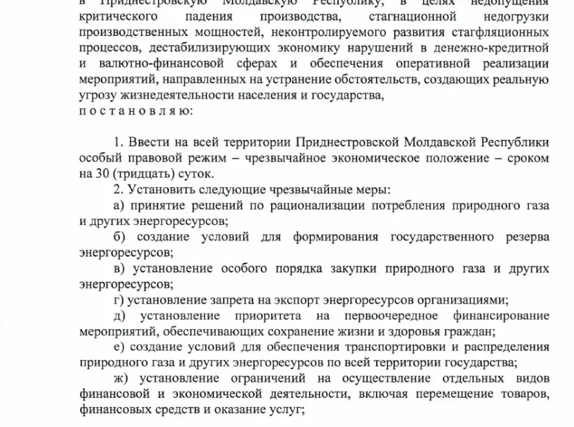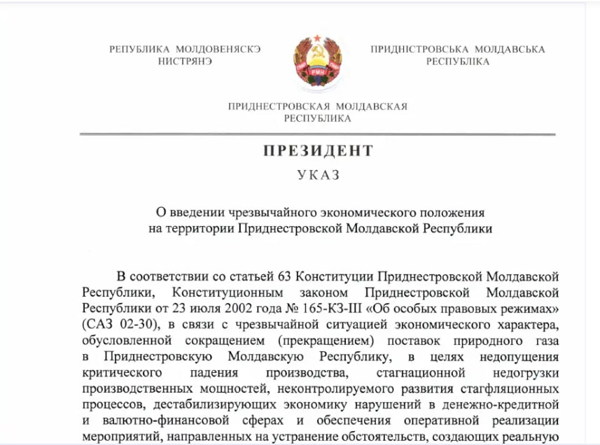В непризнанной Приднестровской Молдавской Республике был введен режим чрезвычайного экономического положения.