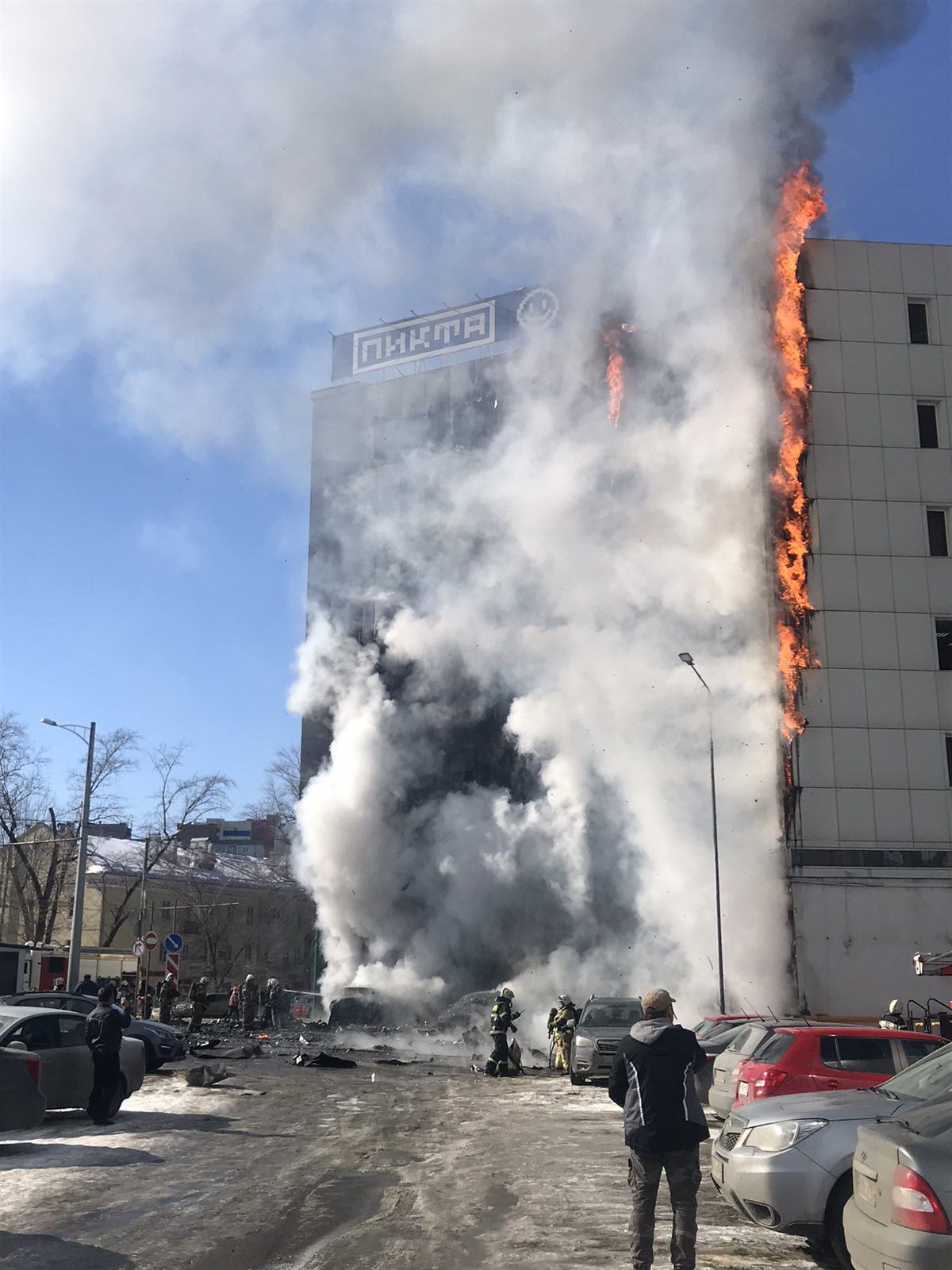 В ТЦ проведена эвакуация. Повреждения получили несколько автомобилей, один сгорел дотла, на парковке ТЦ, так как на них падали фрагменты обгоревшего фасада. Спасатели пытаются вручную оттащить автомобили со стоянки у ТЦ.
