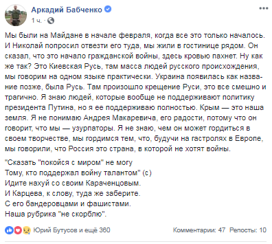 "Вот, странное дело. Смотришь - ну, талант же. Гений! А потом откроет рот - неа, не гений. Просто фашиствующий имперец. И так практически с каждым. Вот что за феномен? Что им там в чай подливают?", - пишет Бабченко.