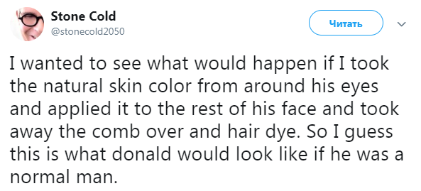 "Я хотел посмотреть, что будет, если взять натуральный цвет кожи вокруг его глаз и применить к остальному лицу, а также убрать шевелюру и краску для волос. Поэтому скорее всего вот так выглядит Дональд, если бы он был обычным человеком", – пишет пользователь.